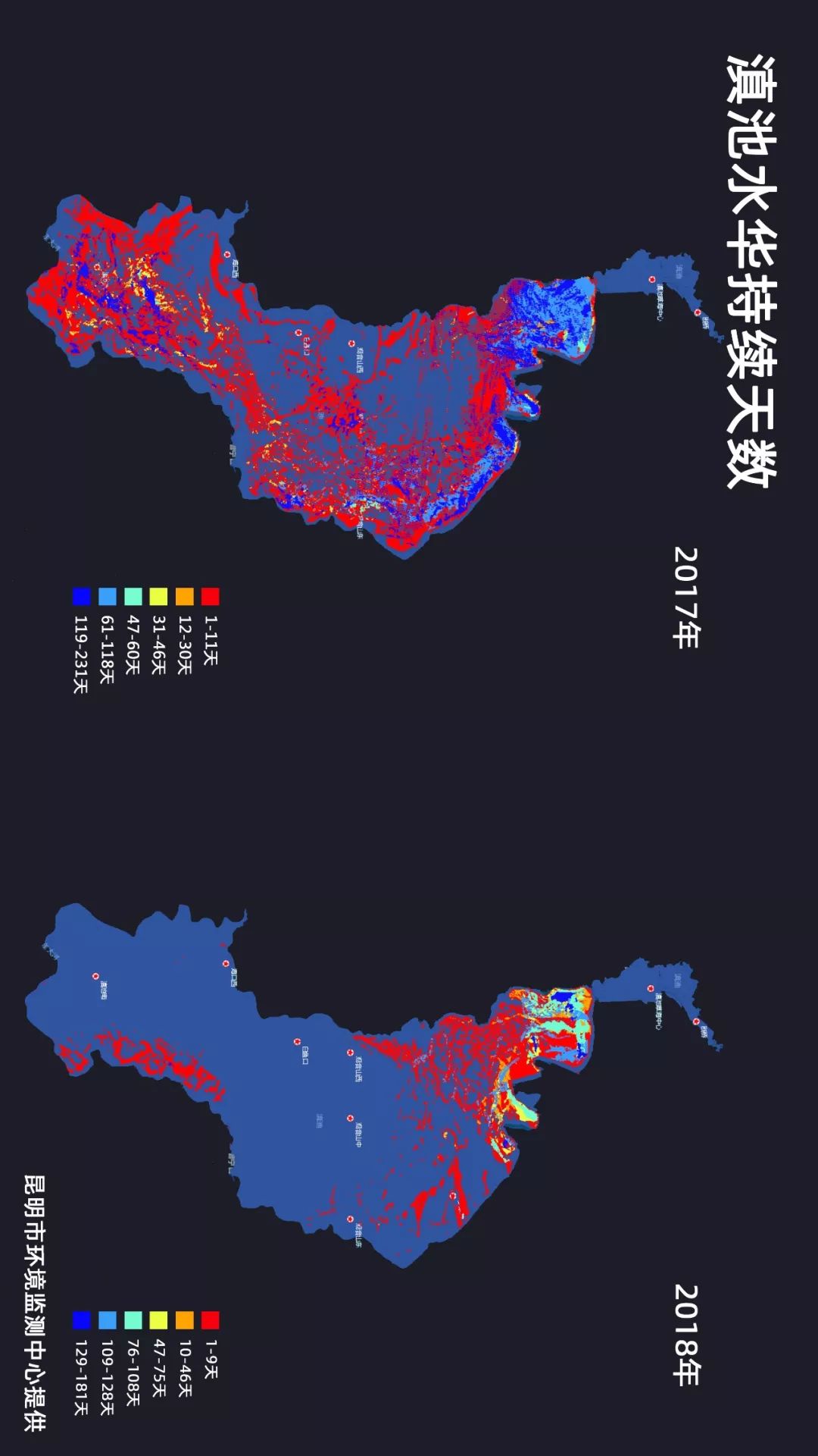 将2017年与2018年滇池(不含草海)疑似水华情况进行对比,大部分水域已不再出现明显的水华情况。