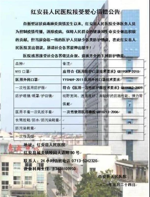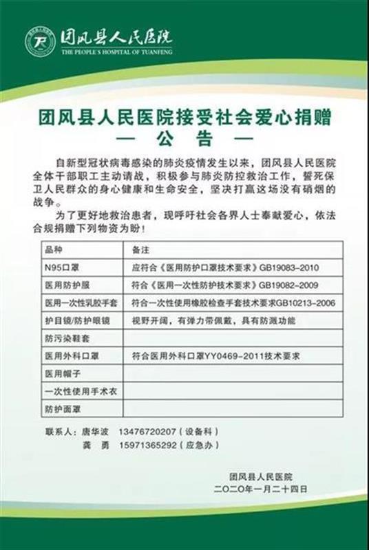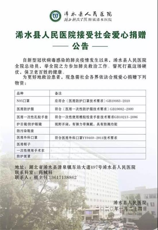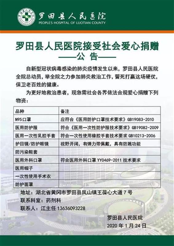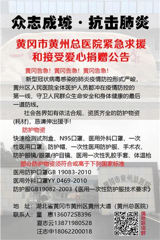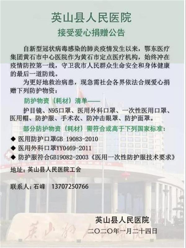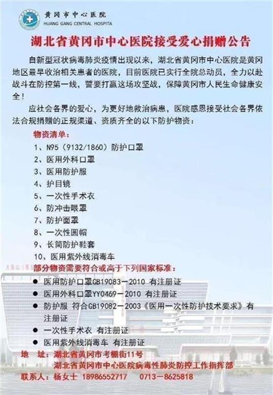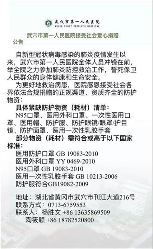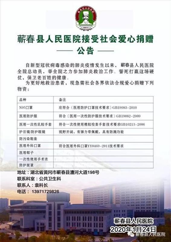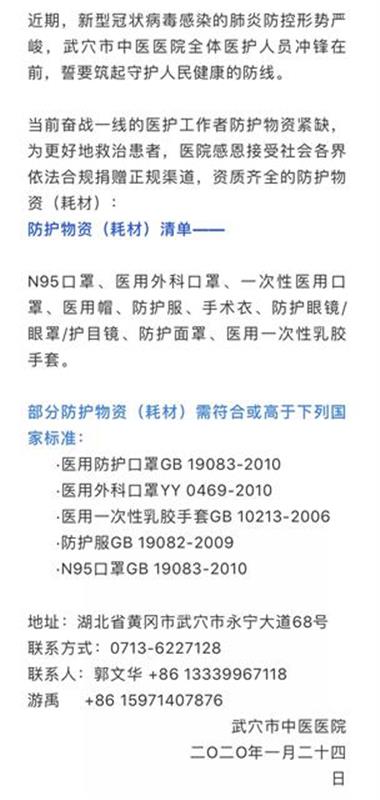 1月25日,黄冈市黄州总医院发布了紧急求援和接受爱心捐赠公告,列出了紧缺的防护物资的品类和规格,表示“社会各界如有依法合规、资质齐全的防护物资(耗材),恳请伸出援手!”