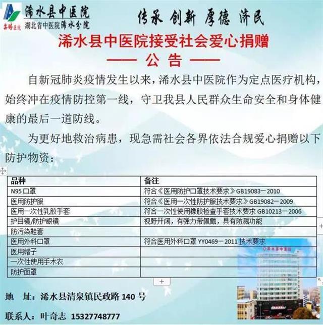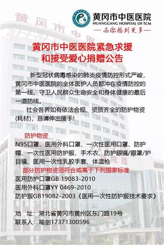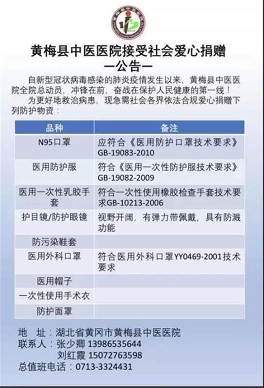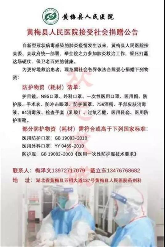 此外,黄梅县人民医院、蕲春县人民医院、团风县人民医院、浠水县人民医院、浠水县中医院等黄冈辖区的多家医院均发布了接受爱心捐赠公告。