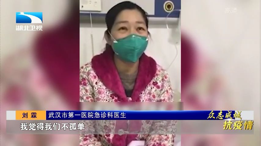 武汉市第一医院急诊科医生 刘霖:我是一名不幸被病毒感染的医护人员,我觉得我们不孤单,我的大学同学他们都已经收拾新囊,加入我们的队伍,等到我脱离隔离期,身体恢复健康的时候,我一定要重复战场,武汉一定能赢!