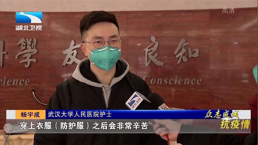 武汉大学人民医院护师 杨宇成:穿上衣服(防护服)之后会非常辛苦,自己会喘不过气来,有点缺氧,但还是要把自己每一个护理工作做好。