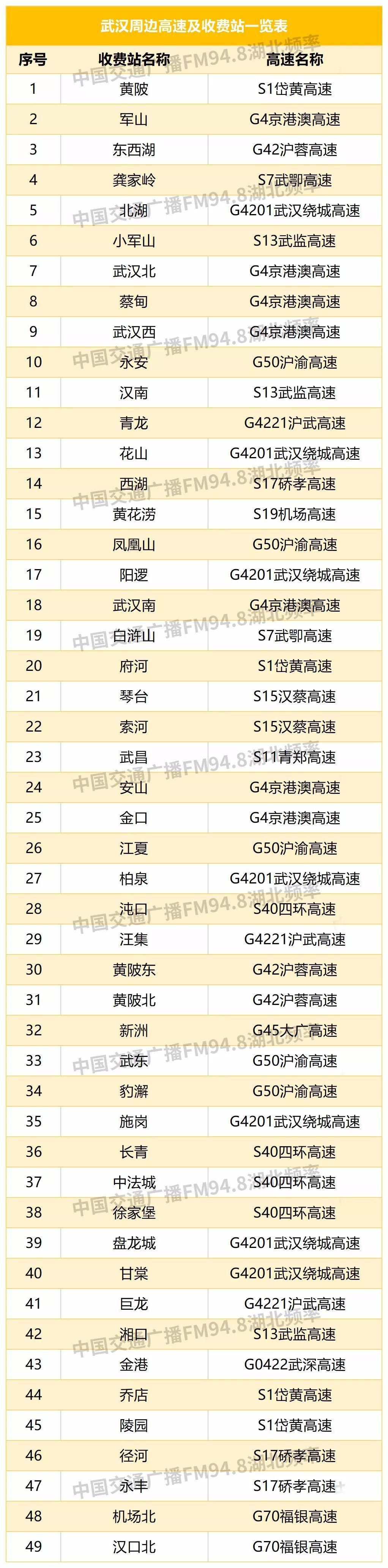 据了解,进出武汉周边的高速公路涉及17条高速上的49个收费站。从1月23日早上开始,这49个收费站相继采取了交通管制措施。针对大家关心的问题,湖北省高速公路应急处置服务中心相关负责人介绍,目前除汉蔡高速索河、机场高速黄花涝、武汉四环线中法城三个收费站实行出入口全部封闭外,其他46个收费站出口都可以正常进入武汉市。
