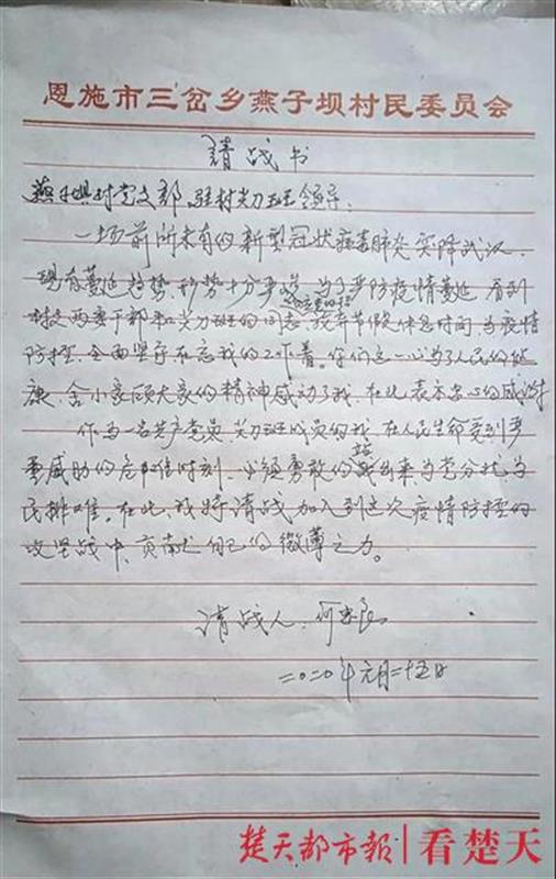 26日年初二,恩施州委政研室三岔镇燕子坝村“尖刀班”收到村里老党员何忠良的请战书。驻村的沈主任告诉记者,所有村支两委干部看到后都十分感动,何老作为老党员、老支书,时刻关心国家大事,惦记群众安危,充分体现了共产党员的初心所在和使命担当。很快,“尖刀班”给何老回复,批准其请战书。在这样特殊的时刻,需要每一位党员、每一位村民代表和小组长,村里的大学生、退休老干部,以及返乡过年的党员干部,都能勇敢的站出来。考虑到何老年事已高,正值数九寒冬,不便外出上路开展防控,所以希望何老安心在家,带头通过电话和网络开展防控宣传。一是以身作则,带头搞好个人和家庭卫生。出门戴口罩,不握手,勤洗手,屋通风,不接触野生动物,不吃野味,生熟分开,鸡鸭鱼肉一定要煮熟,掌握一些常用的防疫常识,同时要求家人共同遵守,共同为生命健康筑起一道屏障。二是当好信息员。有的乡亲从外面回来,隐瞒有关情况不报告,这个时候你们若知晓,就要用电话、微信及时向“尖刀班”和村支两委反映。三是过年不串门、不拜年、不聚餐。首先带头不拜年,尽量不出门,也不接受亲朋好友拜年,珍贵的亲情就是互相体谅和尊重,尊重对方的生命可贵。农村有句俗话“有心拜年端午不迟”,等我们把病毒扫荡干净,再来相聚,会更开心,也更放心。