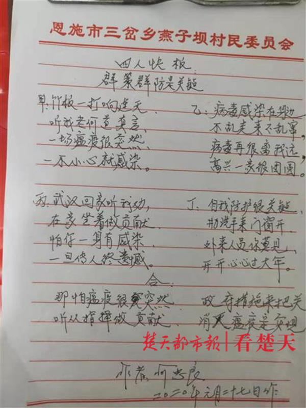 何忠良收到回复后,立即以自己的行动为疫情防控出谋划策。他的女儿何莉谁说,所有家庭成员目前都在家,一直没有外出,吃喝所用能自给自足充分保障。这两天何老还自编了一首防疫快板书,手写后也发到村里的各级微信群里,呼吁村民们都参与进来。记者看到,快板书朗朗上口,把疫情的危险和防控的重点都点了出来:“竹板一打响连天,病毒感染在身边,听我老何道真言,不乱走来不乱窜……武汉回家听我劝,在家坐着做贡献,外来人员你莫见,开开心心过大年。”
