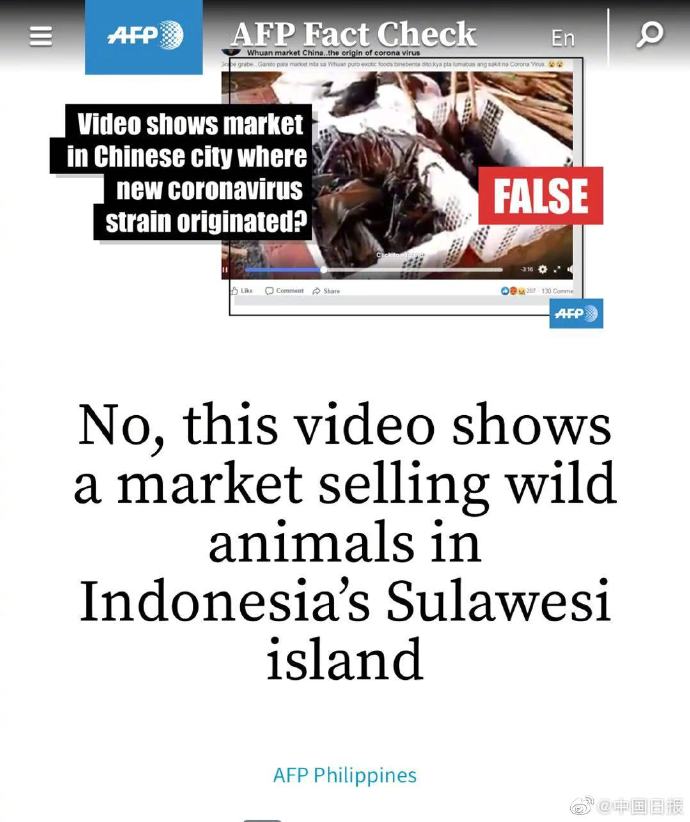 近日,境外社交媒体流传一条据称是武汉野生动物交易市场的视频,这条4分41秒的视频发于1月26日,画面中蛇、蝙蝠、鼠类等各类野生动物在市场中进行售卖。配文用英语和他加禄语写道:“这就是中国武汉的市场,售卖各种野味,新型冠状病毒就是这么来的……”目前视频已有数万次浏览数,评论不乏谴责之声。1月27日,法新社发文辟谣,称该视频截图后经视频核实工具查验,实为印尼的苏拉威西岛的野生动物市场,去年7月20日发布。目前,该视频已被脸书软件标注为假消息。疫情当前,野生动物市场作为病毒“温床”,已被国家三部门发文严令禁止。但面对网上各类境内外舆论,我们也要擦亮眼睛,不要被谣言蒙蔽双眼。(记者 李雪晴)