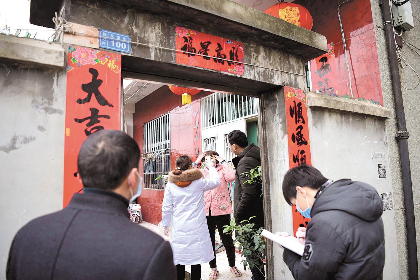 1月26日,云梦县医护人员挨家挨户走访,进行查体温、登记家庭成员信息等工作,做好社区防控。 (视界网 杨宏斌 摄)