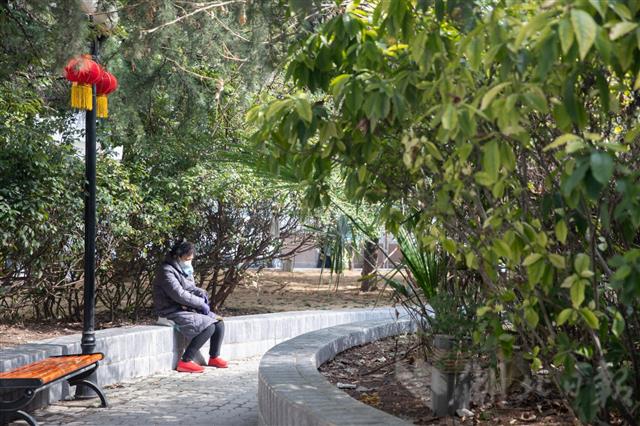 2月1日,前来就诊的市民在武汉市第八医院卓尔长江应急医院里晒太阳。(湖北日报全媒记者 柯皓 摄)