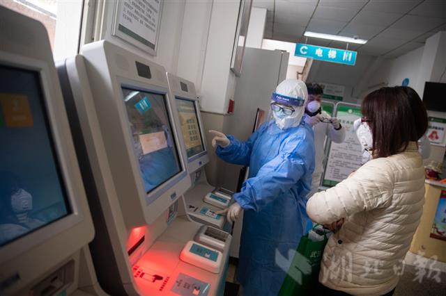 图为护士帮助患者挂号。(湖北日报全媒记者 柯皓 摄)