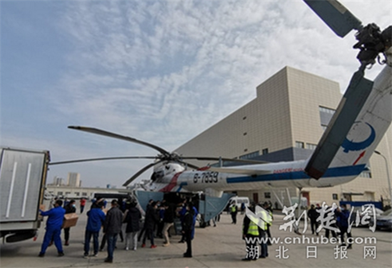荆楚网客户端-荆楚网消息(记者张城、通讯员李伟、刘利鹏)2月1日下午,一架直升机缓缓降落在武汉市光谷七路国药控股湖北物流中心院内,在装载一批防疫急需物资后,随即起飞奔赴宜昌。这也是此次疫情发生后,湖北首次采取空运的方式运输防疫物资。