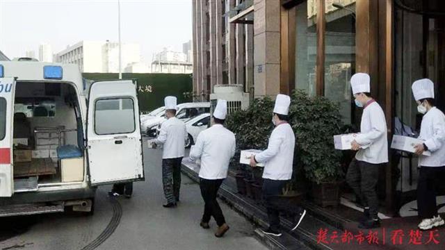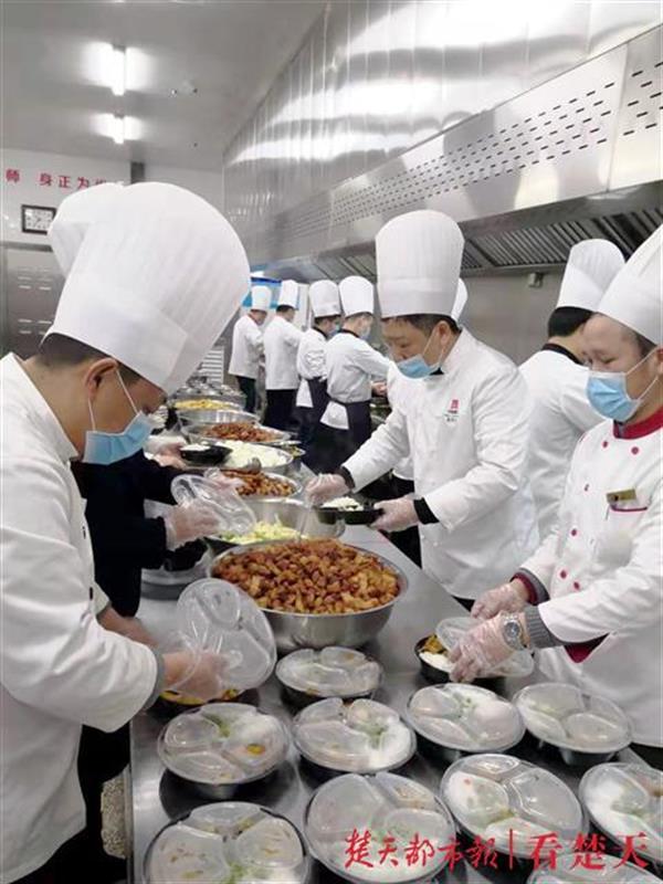 与此同时,汉口青年路附近一家大酒店内邹志平工作室的董新洲带着的厨师团队已把饭菜准备好了,让武汉市肺科医院轮班来休息的医护人员能随到随吃;在洪山雄楚大道一家酒店内,厨师带着弟子们正把做好的饭菜送上医院来接的车上。