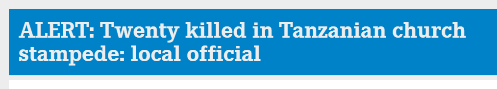 【环球网快讯】法新社援引坦桑尼亚官员消息称,该国一教堂发生踩踏事件,造成20人死亡。