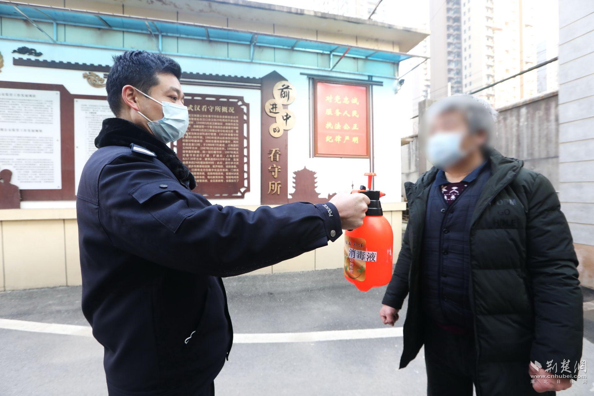 2月1日,李路出所前,武汉铁路公安处看守所教导员吕宏鹰对其衣物和双手消毒。(通讯员供图)