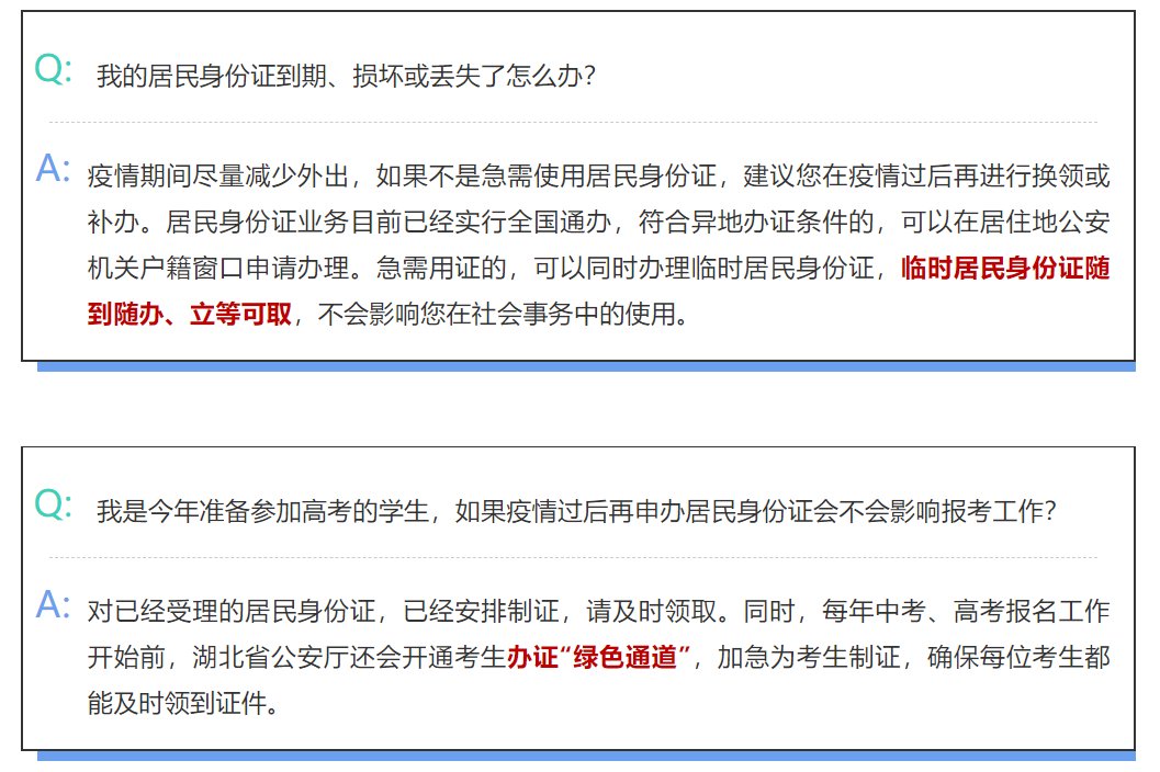 今年准备参加高考的学生,已经办理过居民身份证的,湖北公安机关已经安排制证,可及时领取。同时,每年中考、高考报名工作开始前,湖北省公安厅还会开通考生办证“绿色通道”,加急为考生制证,确保每位考生都能及时领到证件。