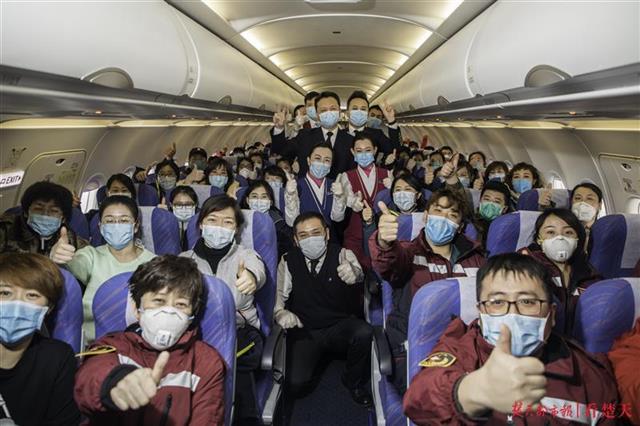 15时43分,黑龙江省医疗人员从齐齐哈尔乘坐南航CZ5245航班飞赴武汉,这是黑龙江省派出的第二批赴武汉医疗队伍。