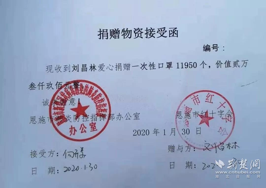 此前,刘昌林就时刻关注着恩施州内外肺炎疫情,1月30日,他便为恩施市肺炎防控指挥部捐赠一次性口罩11950个,价值23900元。