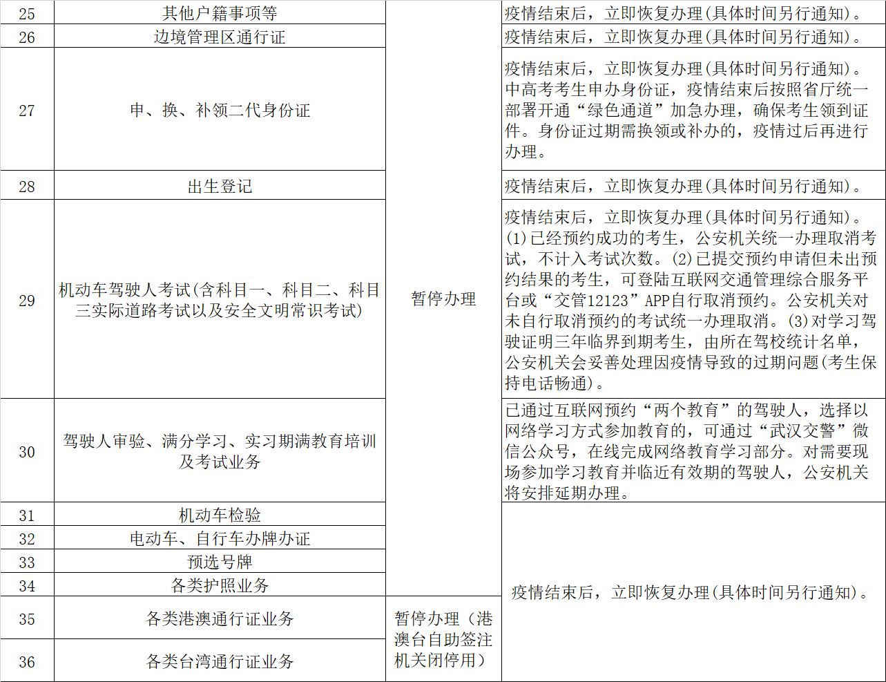 因疫情暂停的机动车驾驶人考试(含科目一、科目二、科目三实际道路考试以及安全文明常识考试),已经预约成功的考生,公安机关统一办理取消考试,不计入考试次数。已提交预约申请但未出预约结果的考生,可登陆交通管理综合服务平台或“交管12123”APP自行取消预约。公安机关对未自行取消预约的考试统一办理取消。学习驾驶证明三年临界到期考生,由所在驾校统计名单,公安机关会妥善处理因疫情导致的过期问题(考生保持电话畅通)。暂停的驾驶人审验、满分学习、实习期满教育培训及考试业务,已通过互联网预约“两个教育”的驾驶人,可通过“武汉交警”微信公众号,在线完成网络教育学习部分。对需要现场参加学习教育并临近有效期的驾驶人,公安机关将安排延期办理。