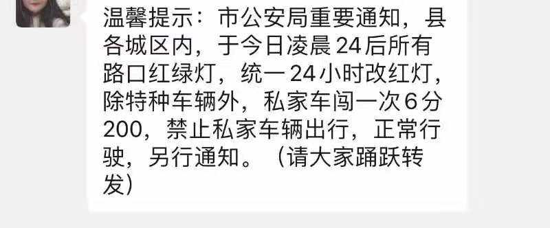 经查,万某(女,32岁,青神县白果乡人)于2月4日10时30分许,在其微信群转发“温馨提示:市公安局重要通知,县各城区内,于今日凌晨24后所有路口红绿灯,统一24小时改红灯,除特种车辆外,私家车闯一次6分200,禁止私家车辆出行,正常行驶,另行通知。(请大家踊跃转发)”的虚假信息。导致该虚假信息在青神本地微信群中相续转发,引起广大群众猜测、质疑、恐慌。