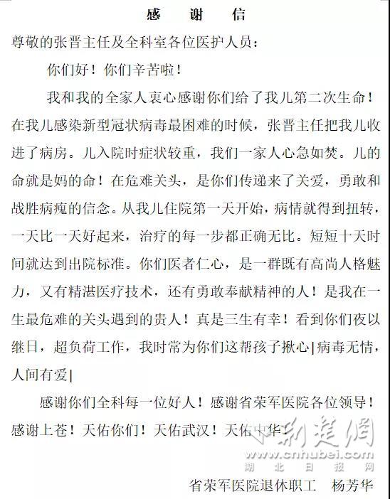 荆楚网客户端—荆楚网消息(通讯员 孙四海)“在我儿感染新型冠状病毒最困难的时候,张晋主任把我儿收进了病房,衷心感谢你们给了我儿第二次生命。”2月5日,湖北省荣军医院收到了一封来自患者家属的感谢信,信中提到的老年病科主任张晋从23日起便战斗在发热病区,已有半个月没有回家。