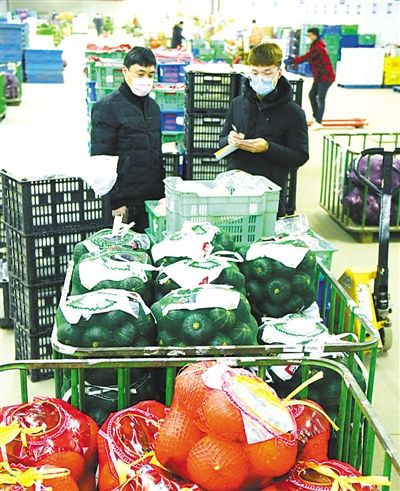 近日,各地积极做好公共服务和各项保障。图为石家庄市北国超市果蔬配送中心,工作人员对新采购的果蔬进行登记核对。新华社发