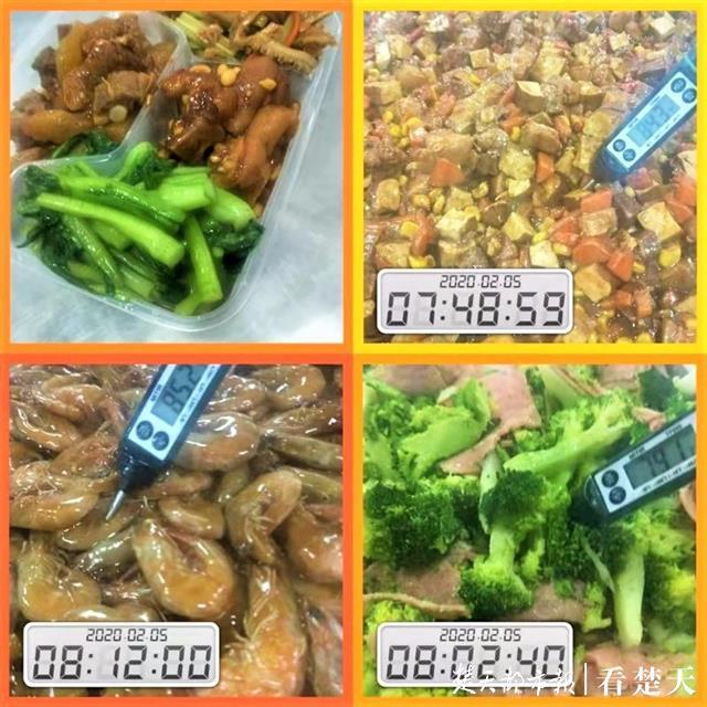 “前线在救命,后方做饭菜,安全、卫生丝毫不敢马虎!做不了一线抗击人员,那我们就要尽自己的力量做好二线。”餐饮团队成员胡华明介绍,每天提供四餐,时间分别为早上六点半至七点半、中午十一点半至十二点半、下午五点半至六点半,最后一餐在晚上十二点。