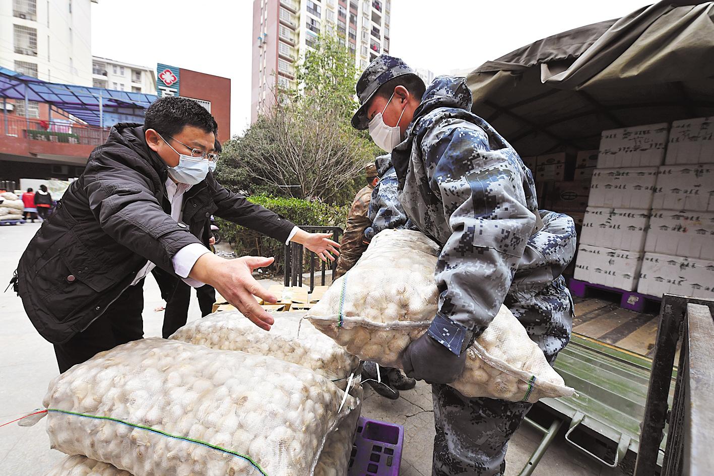 2月2日中午,中百仓储武汉江夏花山店,部队官兵在帮助转运生活物资。当天,驻鄂部队抗击疫情运力支援队出动50台军用卡车,将200余吨生活物资调运至武汉三镇,供应各大超市。