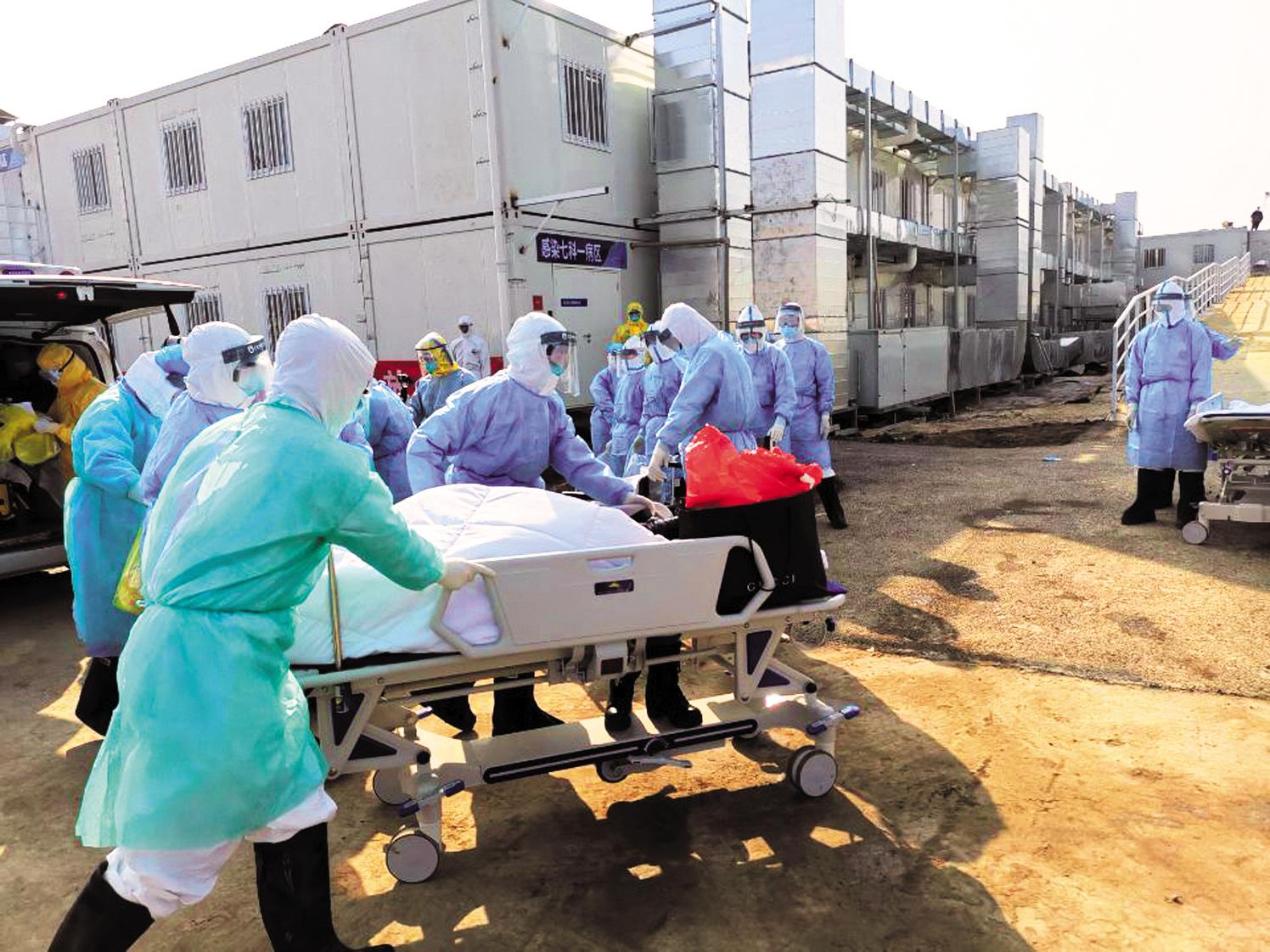 2月4日,武汉火神山医院,解放军医疗队队员运送首批病人入院。
