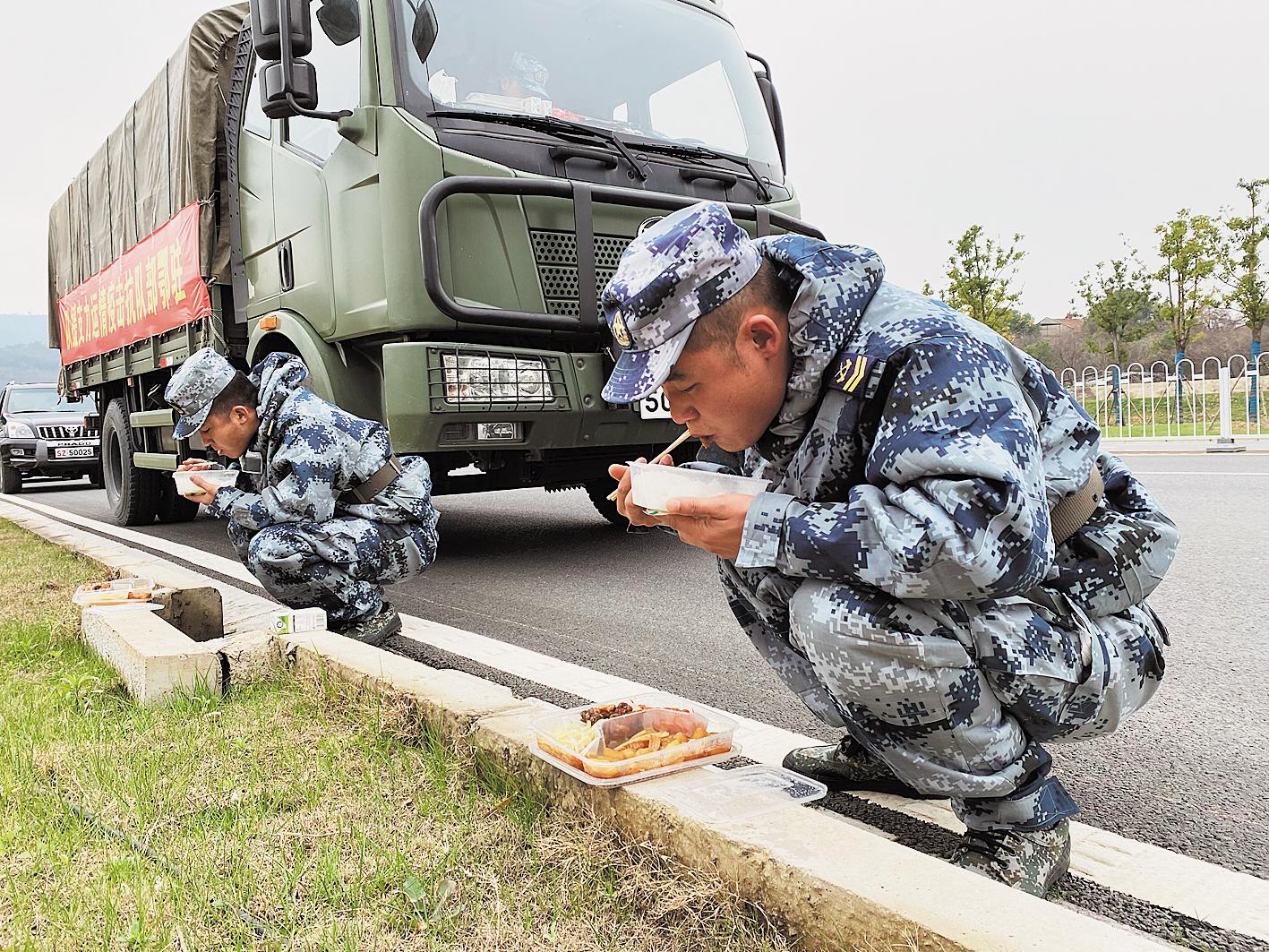 2月2日,担负运输武汉市民生活物资任务的驻鄂部队运力支援队战士,为了节省时间在路边吃盒饭。