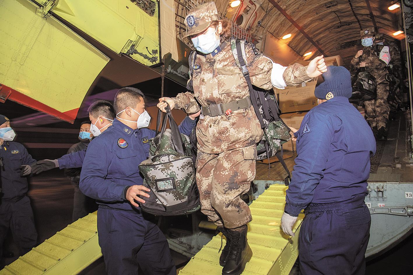 1月24日,农历除夕深夜,一位陆军医疗队队员跳下军用运输机。当晚,陆海空三军军队医疗救护队驰援武汉。