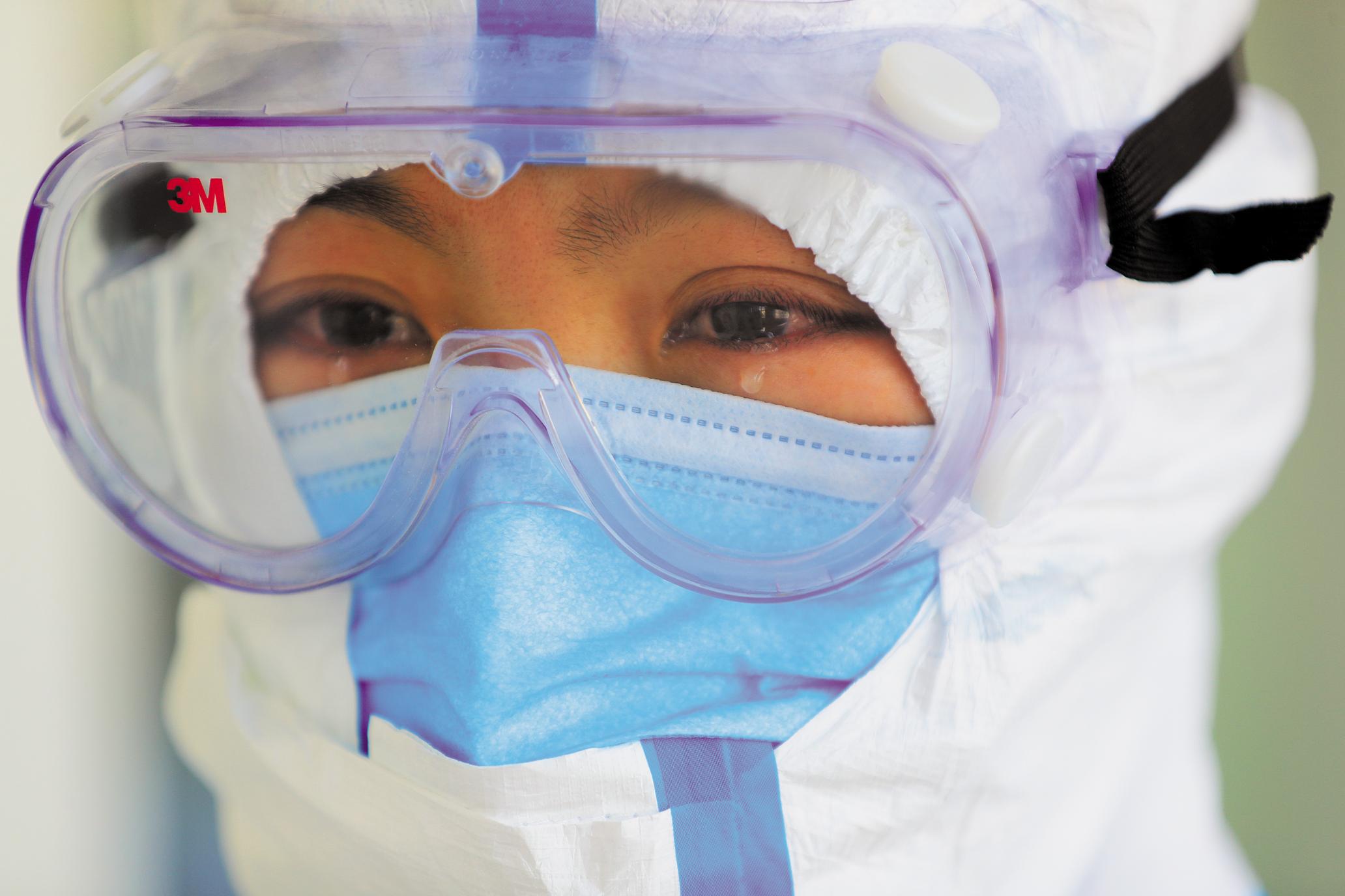 ▲1月29日,中部战区总医院支援武汉肺科医院医疗队的一名护士,因长时间佩戴护目镜而流泪。