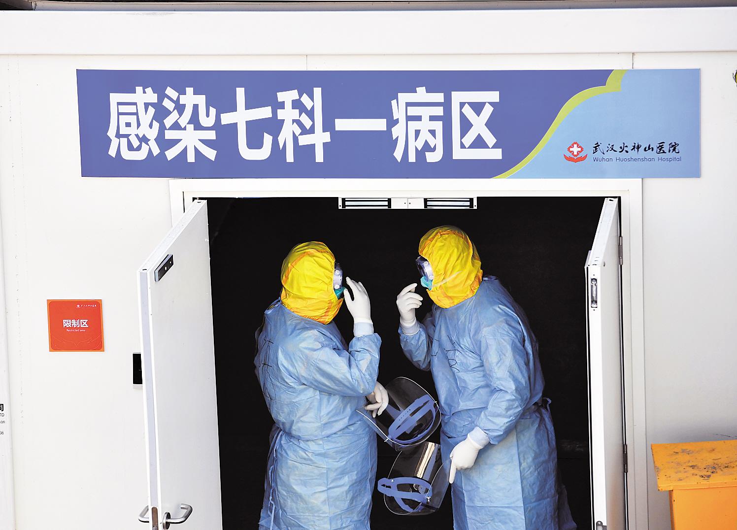 ◀2月4日,武汉火神山医院,两名解放军医疗队队员在互相检查防护措施。