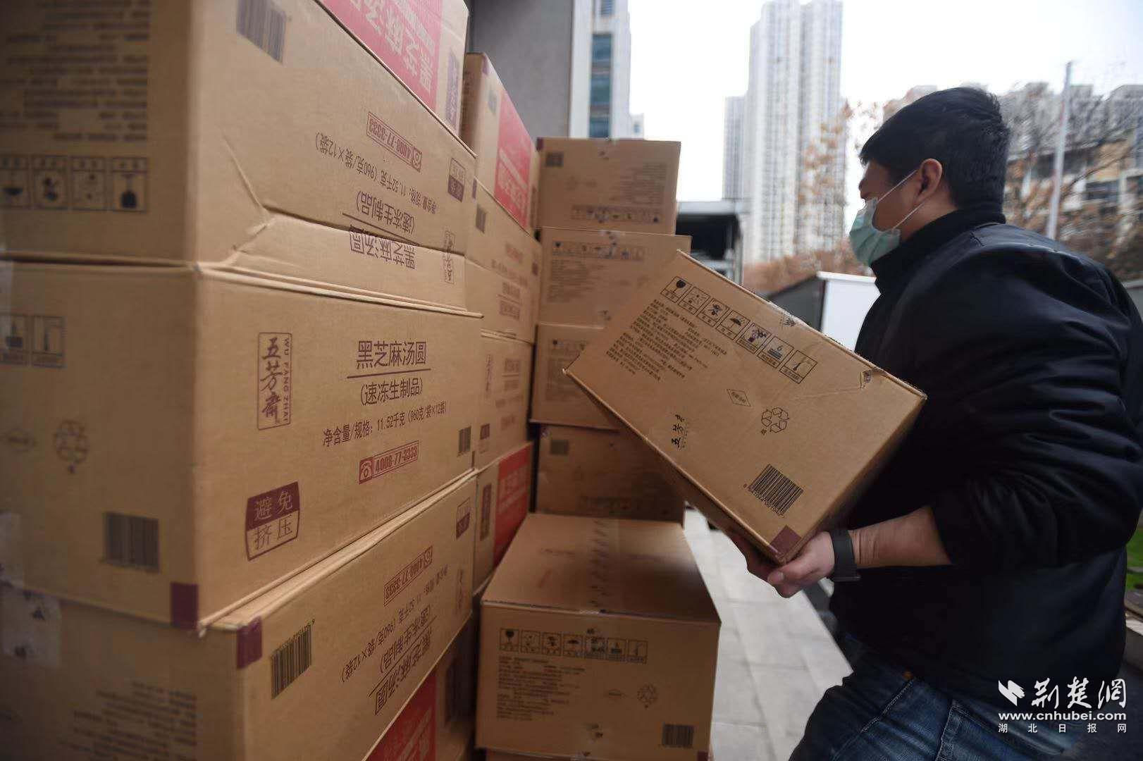 上午10时许,一辆冷链车从位于中山大道的武汉五芳斋总店驶出,直奔江岸区城管委,车上满载着100箱五芳斋汤圆。11时,车辆抵达目的地,工作人员迅速卸下物资,将汤圆移交城管委工作人员。