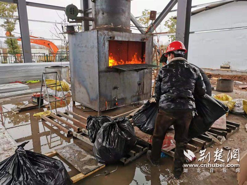图为:武汉洪山体育馆方舱医院医疗垃圾处理站正式运行。