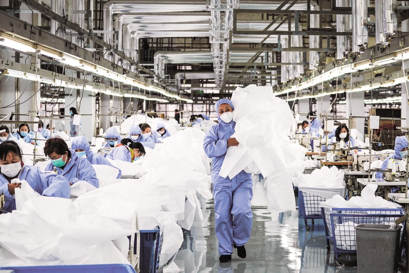 2月8日是元宵节,工作人员在红豆集团防护服生产线上作业。(新华社发)