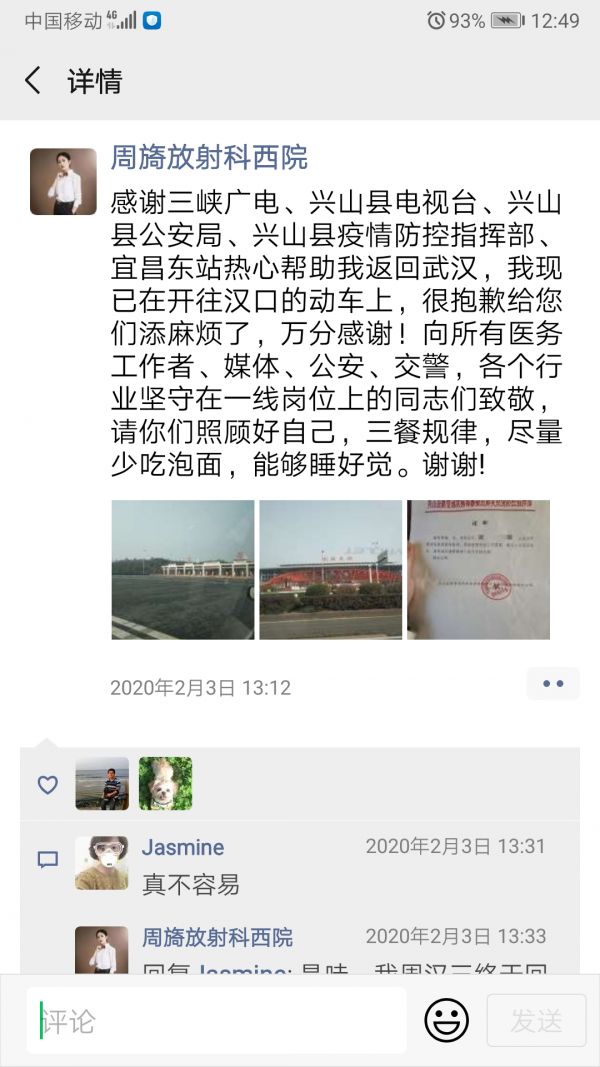 在家隔离的14天,周旖在朋友圈、微信群看到同事们辛苦疲惫的模样,内心煎熬不已,向科室提出返回申请。碍于交通停运,周旖四处联系,希望找到可能返汉的办法,“在家里,我一分钟都待不下去!”其间,周旖先后找医院、志愿者、公安局和电视台等多方求助,最终,兴山县疫情防控指挥部为她开出证明,2月3日上午,刚刚解除14天隔离的周旖由民警一路送到宜昌东站,坐上了返回武汉的动车。