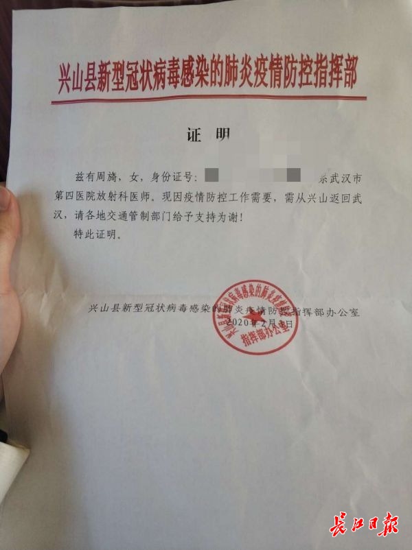 为了回汉,周旖找到兴山县疫情防控指挥部为她开出证明。