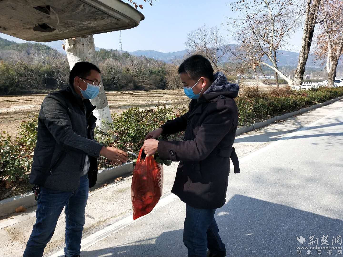 荆楚网客户端—荆楚网消息(通讯员刘钊海、胡吉)2月9日中午时分,英山县金家铺镇李家山村党支部书记宋小勇开车将从本村三家农户“讨来的菜”,送到居住在镇街上宋伟雄等十户户主手中。“感谢老家邻居的热心,更感谢支书的辛苦!” 镇上的老乡们高兴地说。