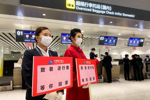 为致敬奔赴抗击疫情最前线的白衣战士,南航地服超大托运柜台张贴着“最美逆行者,CZ5241,等你回家”的祝福语。航班客舱里插满国旗,为白衣战士加油鼓劲。党龄22年的乘务长李鹏表示,能送最美的逆行英雄去宜昌,能为防控疫情出一份力,义不容辞也责无旁贷。