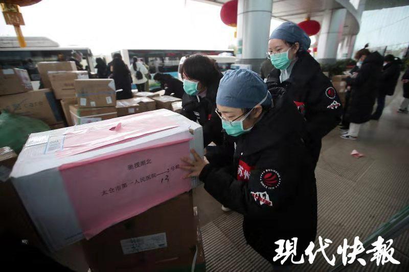 随后,这些医疗物资已经在第一时间用到了重型、危重型病患的救治中。2 月 10 日下午,现代快报武汉特派记者在同济医院光谷院区采访时看到,来自江苏的医护人员正在将带来的医疗物资搬进医院,紧锣密鼓地开展工作。