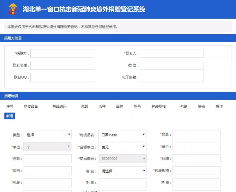 湖北“单一窗口”抗击新冠肺炎境外捐赠登记系统