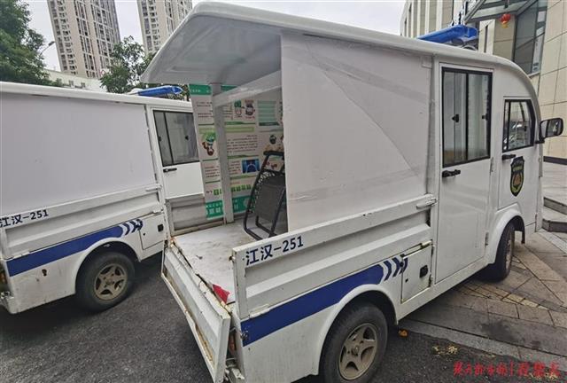 当天,记者在唐家墩街防疫指挥部办公室外,发现有3辆城管执法电动车与众不同,只见驾驶室与车斗被用PPC宣传板隔开。