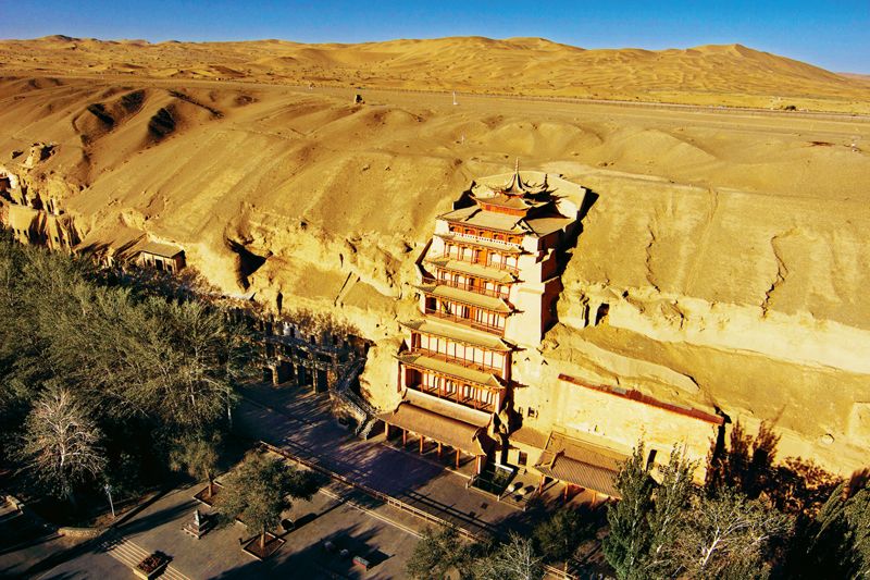 敦煌是河西诸绿洲中为戈壁环绕的最小绿洲,适宜的自然和文化生态环境,不仅使这里成为一千余年各朝开窟不辍、历代造像迭新的特殊佛教圣地,更以遗存的大量中古文书与其他各类文物成为著名的人类文化遗产。图为敦煌莫高窟九层楼全景。 敦煌研究院供图 吴健/摄