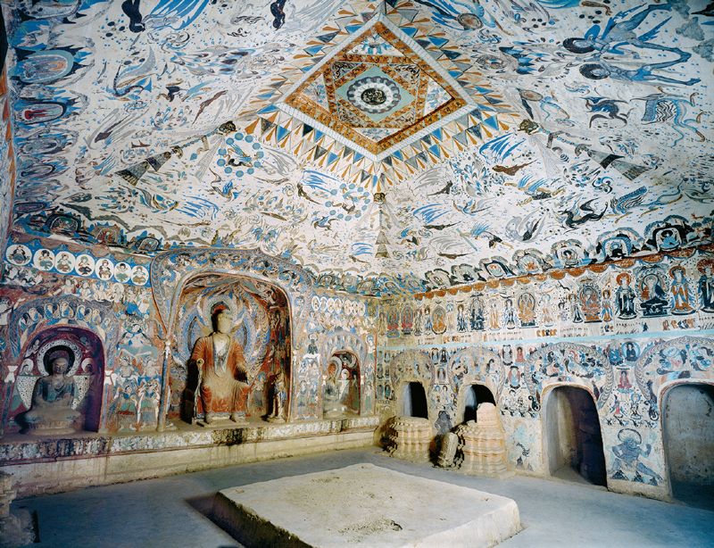 莫高窟第285窟有西魏大统四年(538年)、五年(539年)的题记,是莫高窟最早有明确纪年的洞窟。这一洞窟带有明显的中原风格特征,窟顶都有飞动的彩云和各种传说中的神怪,其中还有中国的神仙,反映了外来佛教与中国本土文化的融合。图为莫高窟第285窟的洞窟形制。 敦煌研究院供图