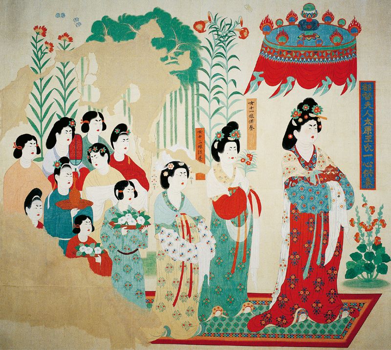 敦煌佛教洞窟的兴建,历代世家大族、甚至皇室贵族是主要推动者。壁画反映了当时人们的现实生活和人生百态。图为段文杰临摹的莫高窟第130窟甬道南壁盛唐时期都督夫人供养像壁画。 敦煌研究院供图 吴健/摄