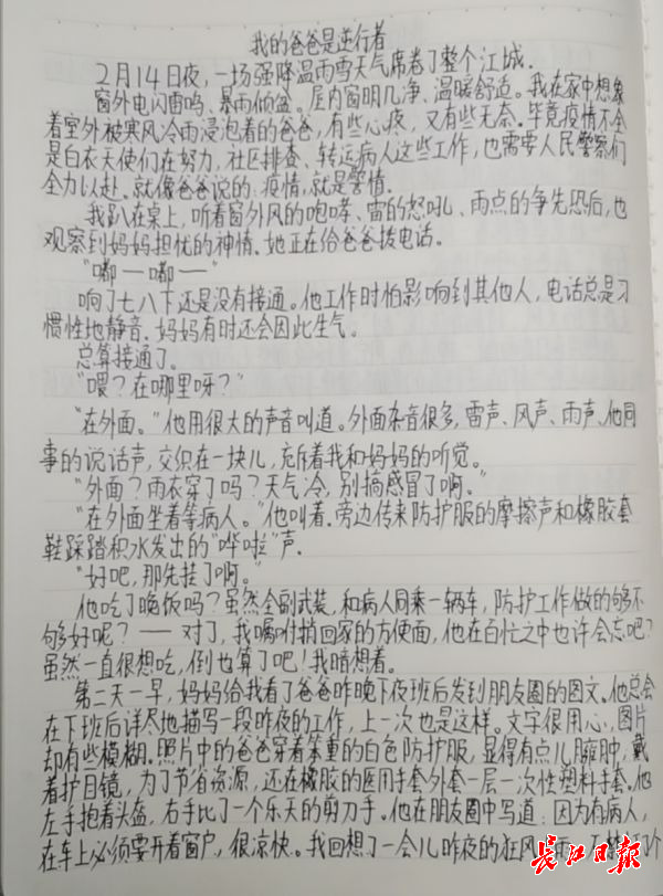 长江网2月19日讯(记者李慧紫 通讯员邹航) “爸爸在朋友圈中写道,‘因为有病人,在车上必须要开着窗户,很凉快。’我回想了一会儿昨夜的狂风大雨,不禁打了个寒颤。‘凉快’,好一个‘凉快’啊,我乐天的爸爸!”2月14日晚武汉温度骤降,雷电交加,12岁的张晛玥整晚都在为在外转运病人的爸爸担心,早上一醒来看到爸爸的朋友圈,一张模糊的照片里他左手抱着头盔,右手比了一个剪刀手,配文说“凉快”,张晛玥在日记中写道“爸爸,我想叫你一声最美‘逆行者’,我为你骄傲!”