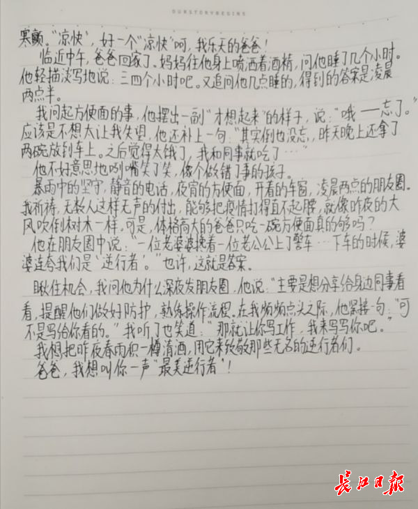 “暴雨中的坚守,静音的电话,夜宵的方便面,开着的车窗,凌晨两点的朋友圈。我祈祷,无数人这样无声的付出,能够把疫情打得直不起腰,就像昨夜呼啸的大风能吹倒树木一样。可是,体格高大的爸爸晚餐只吃一碗方便面真的够吗?”女儿在日记里写道。