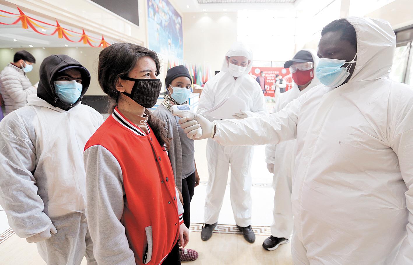 2月19日,中国地质大学(武汉)丝绸之路学院留学生志愿者服务队队员为在校留学生测量体温。武汉抗疫阻击战打响以来,该院来自巴基斯坦、阿富汗、尼日利亚、坦桑尼亚等国家的13名留学生组成留学生志愿者服务队,每天在学院值守,开展疫情预防宣传、院内消毒杀菌等工作。