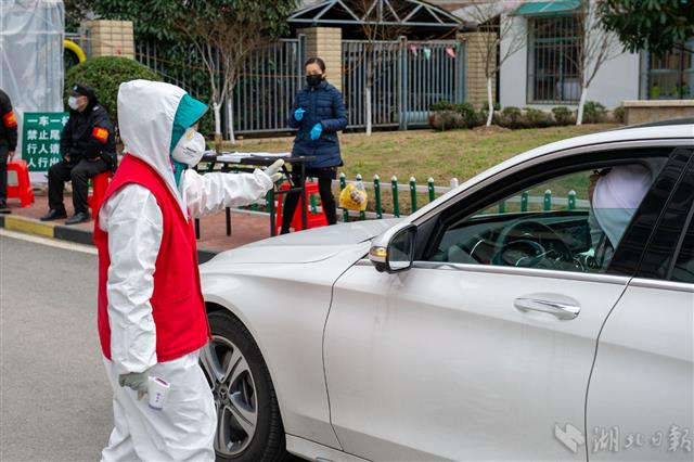 2月19日,武汉市洪山区鹏程社区,志愿者周业萍劝阻外来车辆。