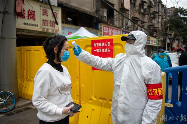 2月19日,武汉市江汉区舞台社区,60岁的老党员肖庭柱(右一)为居民测量体温。肖庭柱是武汉汉欧国际物流有限公司的党委书记,2月8日下沉社区以来,一直坚守社区防疫一线。