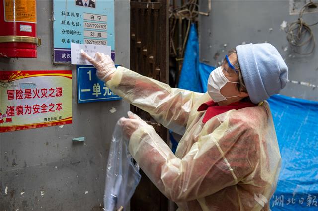2月19日,武汉市江汉区舞台社区,社区工作者李红在已排查的楼栋贴上告示,方便居民监督。50岁的李红是舞台社区第3网格的网格员,也是一名党员,从2月4日开始,她一直坚守社区。如果没有这次新冠肺炎疫情,她本该在这个月退休。