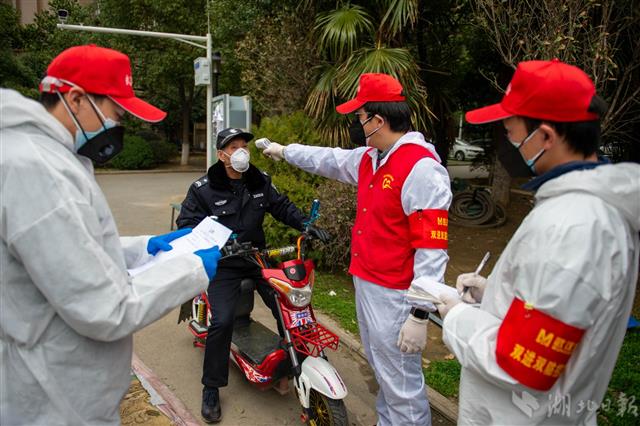 2月19日,武汉市洪山区白马洲社区,武汉地铁集团三名下沉党员杨晓明(右二)、许浩(左一)、常进(右一)为居民测量体温并登记。